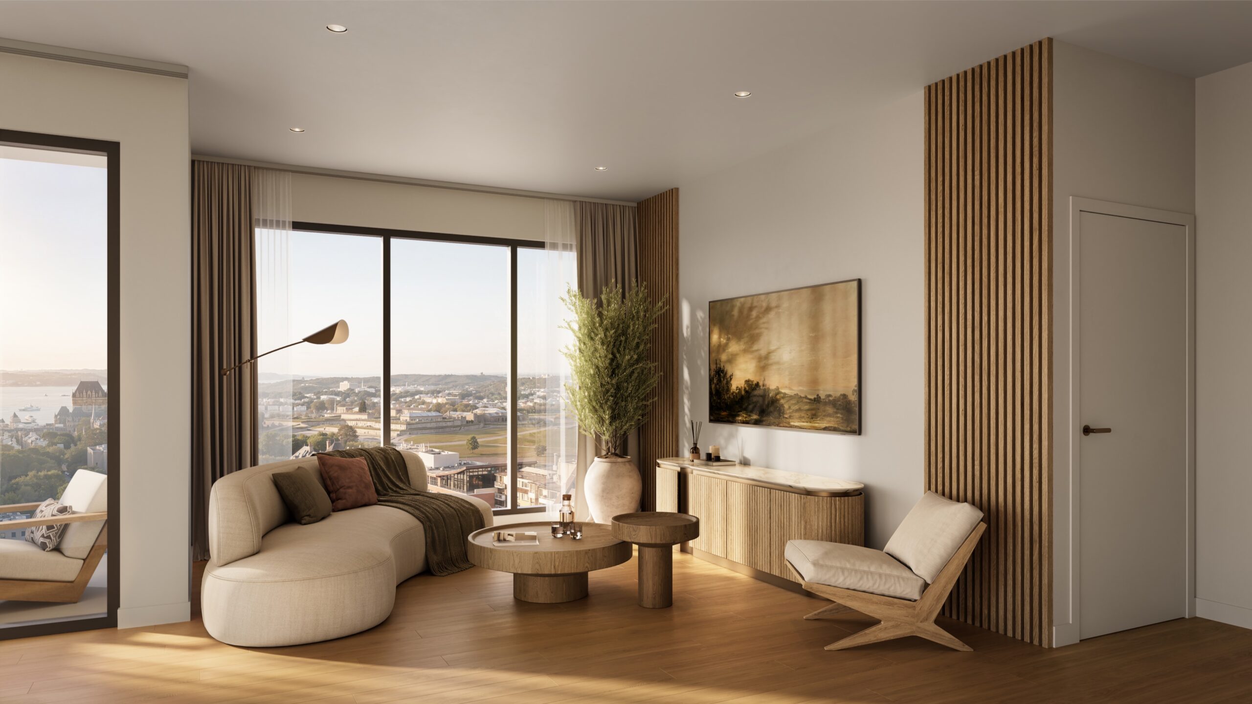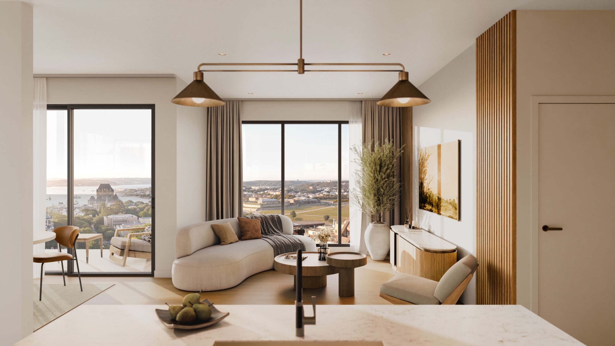 Les condos du Galléon se distinguent par leur élégance sobre et leur confort. Matériaux nobles, éclairage soigneusement réfléchi, fénestration abondante : chaque détail contribue à une atmosphère chaleureuse et lumineuse.